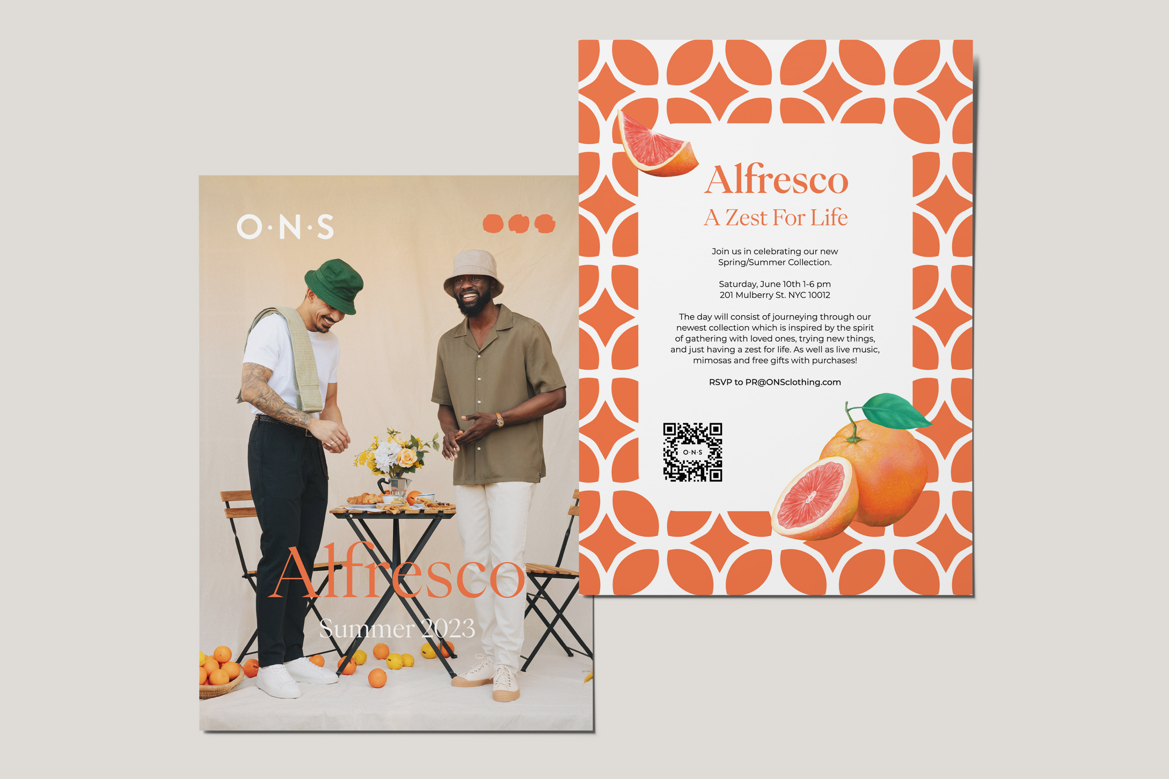 The visual direction for O.N.S Spring/Summer Collection 2023 unfolded in two parts, each mirroring a season's essence. Spring comes alive with zesty Lemons, infusing the color palette into invitations, mailers, and ads while staying true to the brand's logo guidelines. As Summer's heat approaches, the scene shifts to the warm orange hues of Grapefruit. This lively motif was applied to every asset, just like Spring.